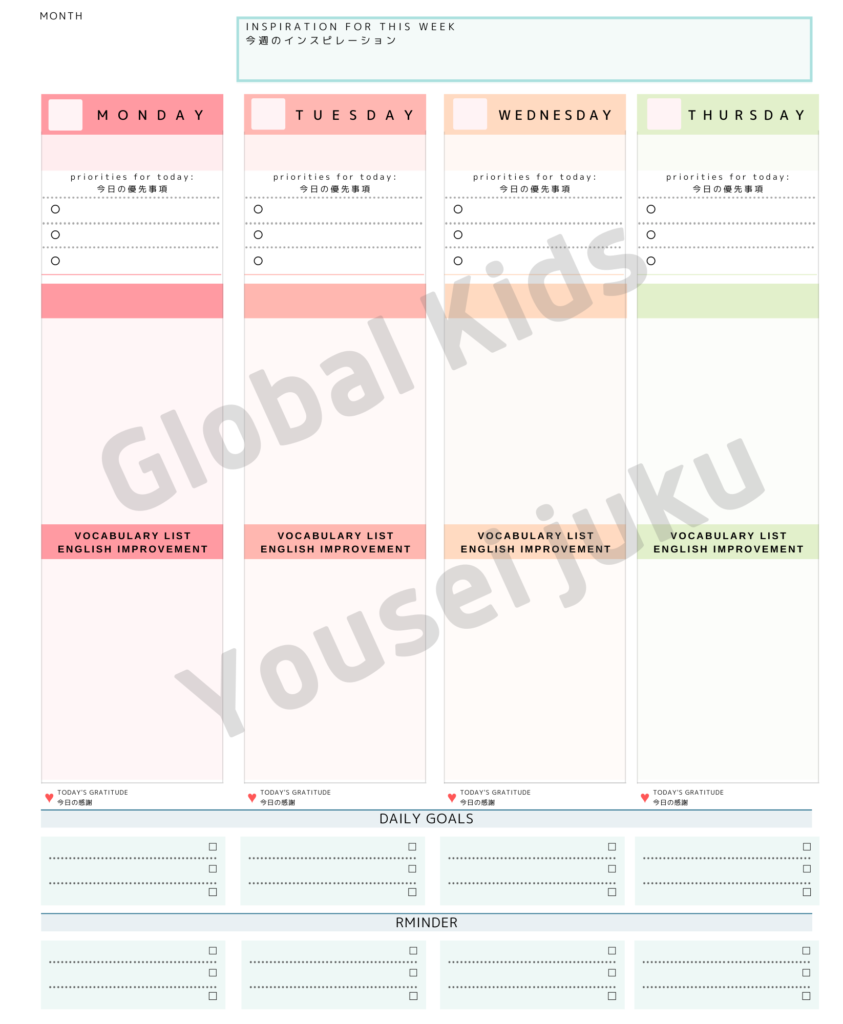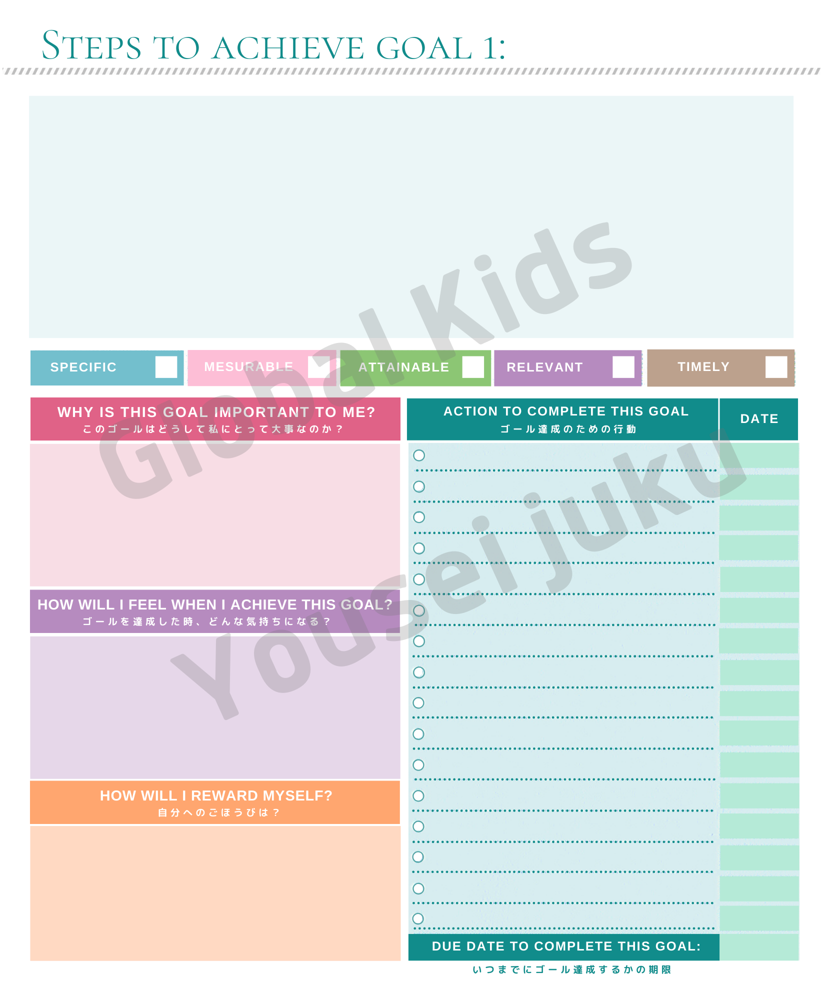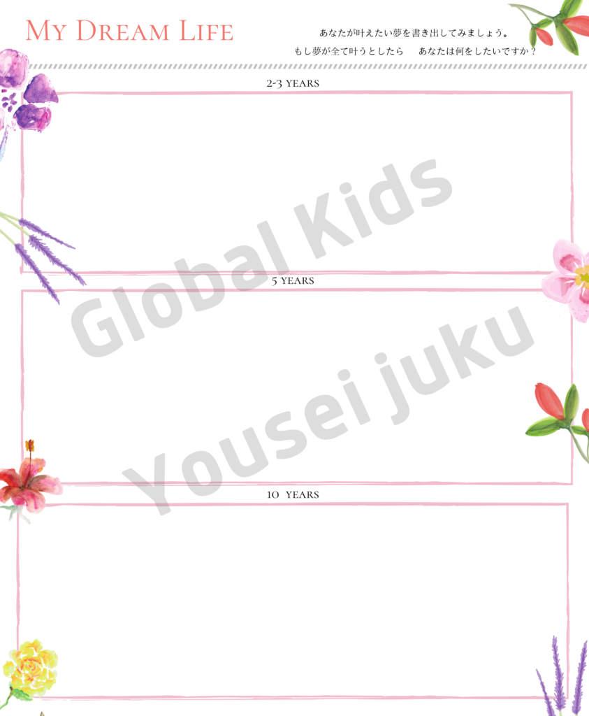 この夢設定の2ページには、あなた自身の夢、親子で叶えたい夢、英語や海外にまつわるワクワクする夢もどんどん書き綴って行ってくださいね。