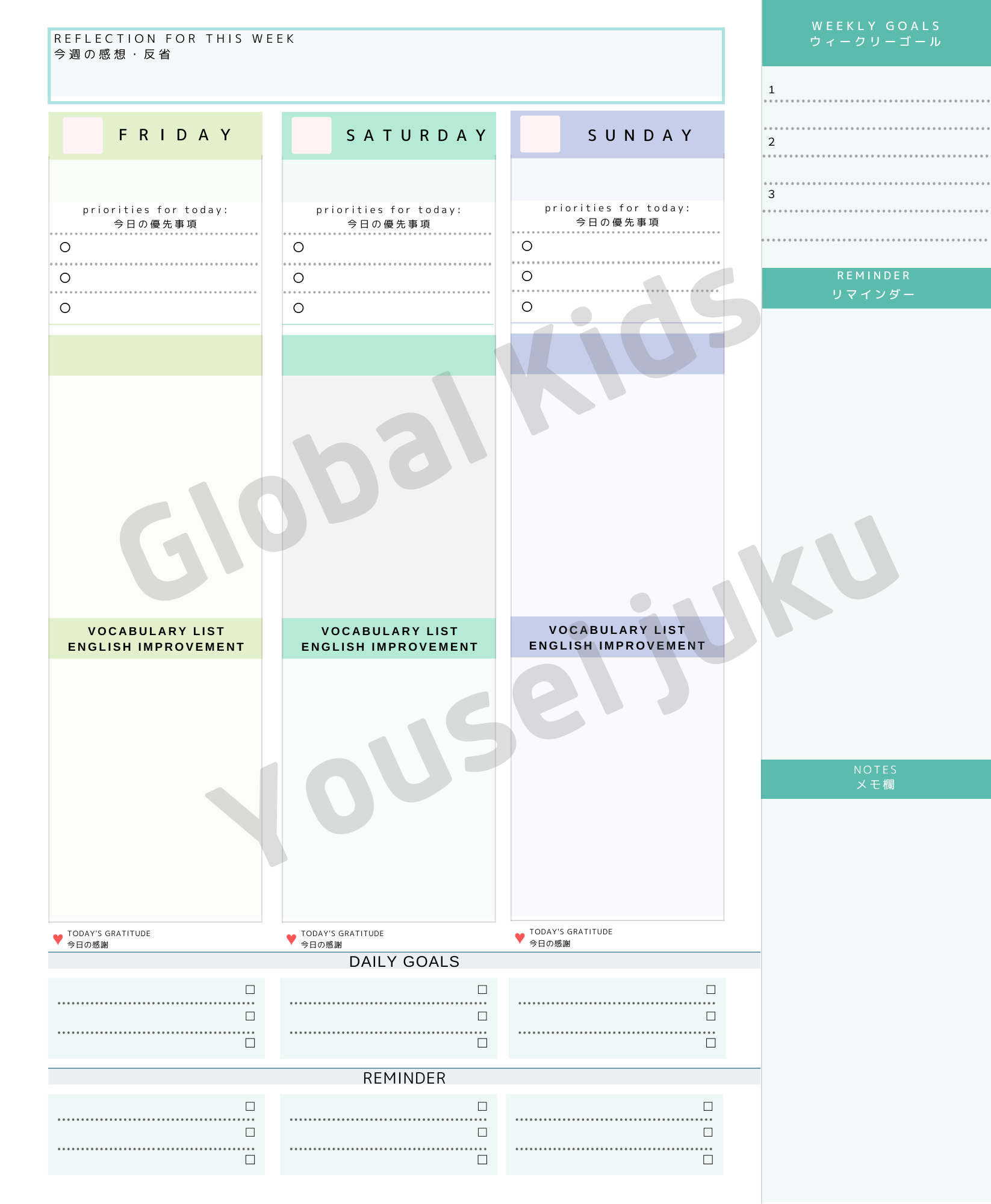 具体的な学習の内容はもちろん、アウトプットができた言葉、フレーズ、新しく学んだ単語、取り組んだテーマ、遊び、やろうと思っている to do listsも付いています。