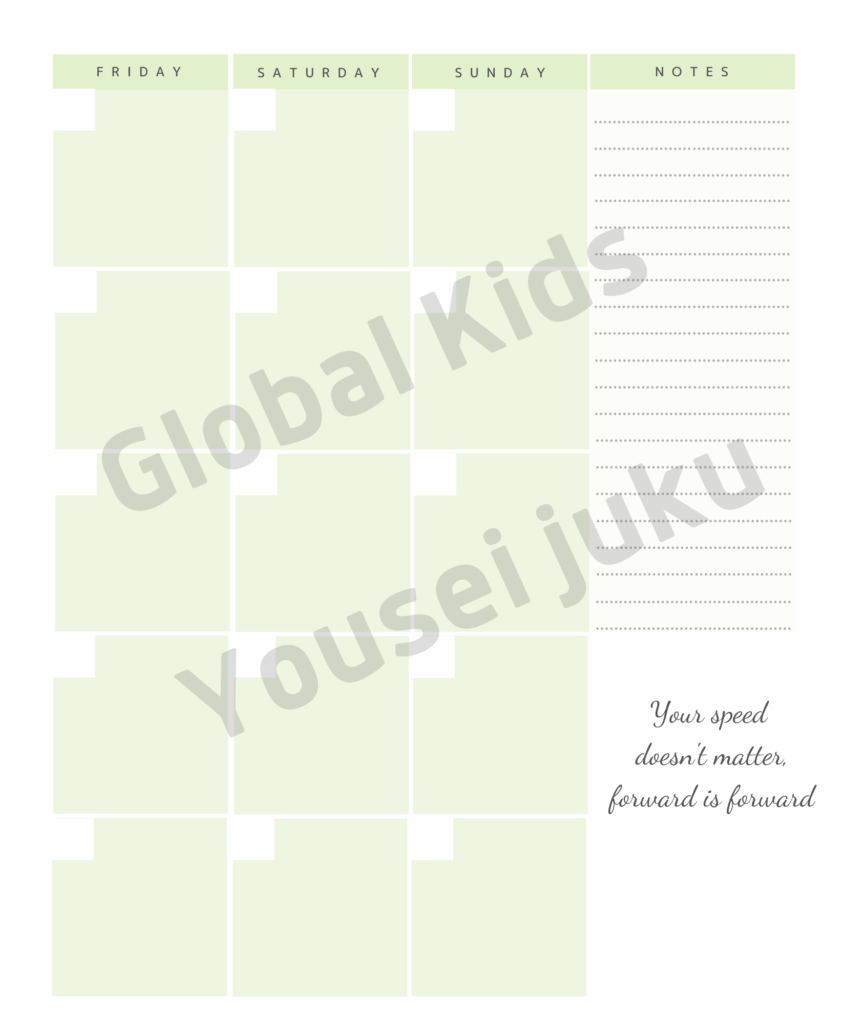 学校や幼稚園関連で忘れてはいけないこと、食事のプラン、この一週間を通してやらなければならないこと、忘れてはいけないことなども一緒に書いてしまいましょう。