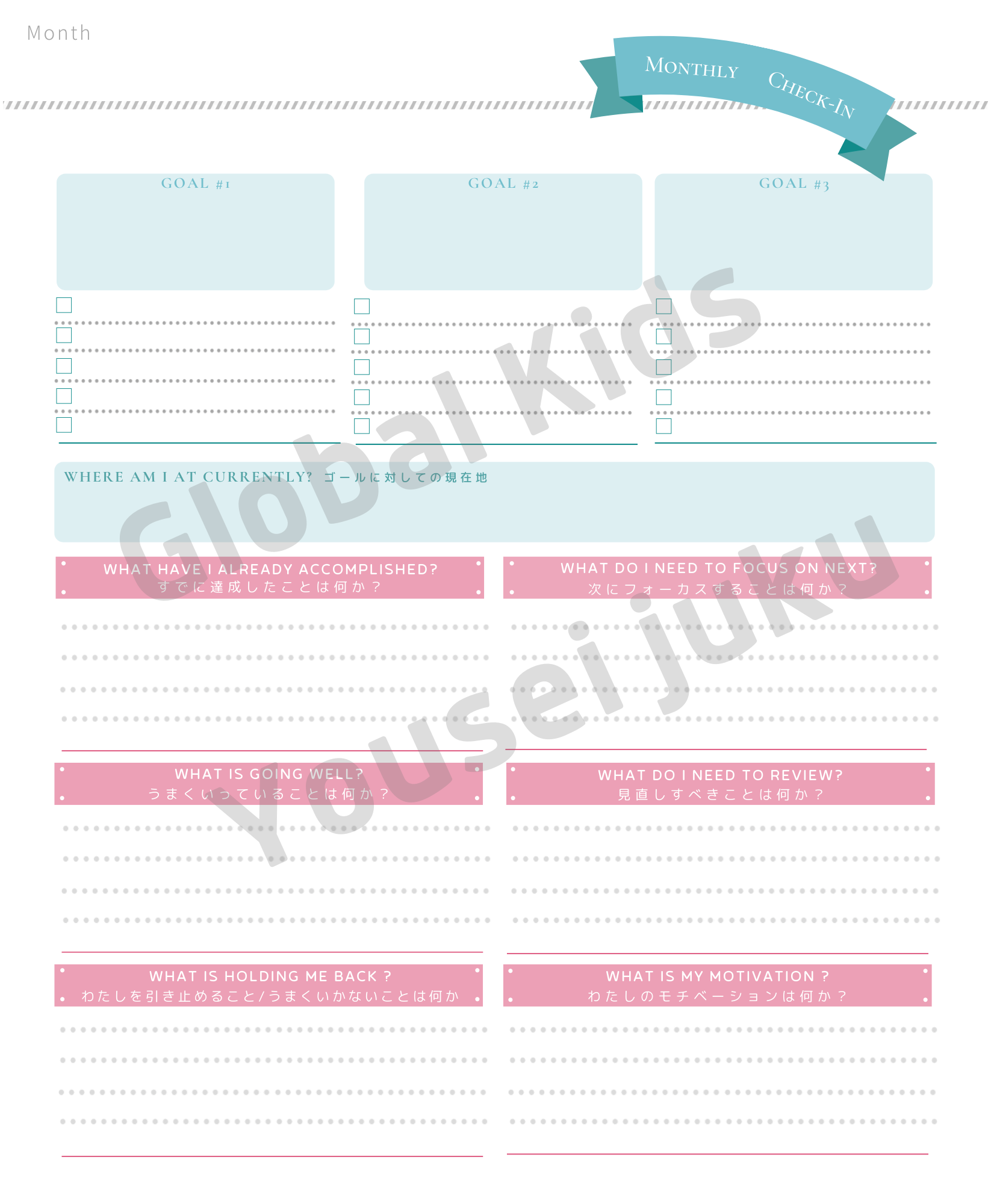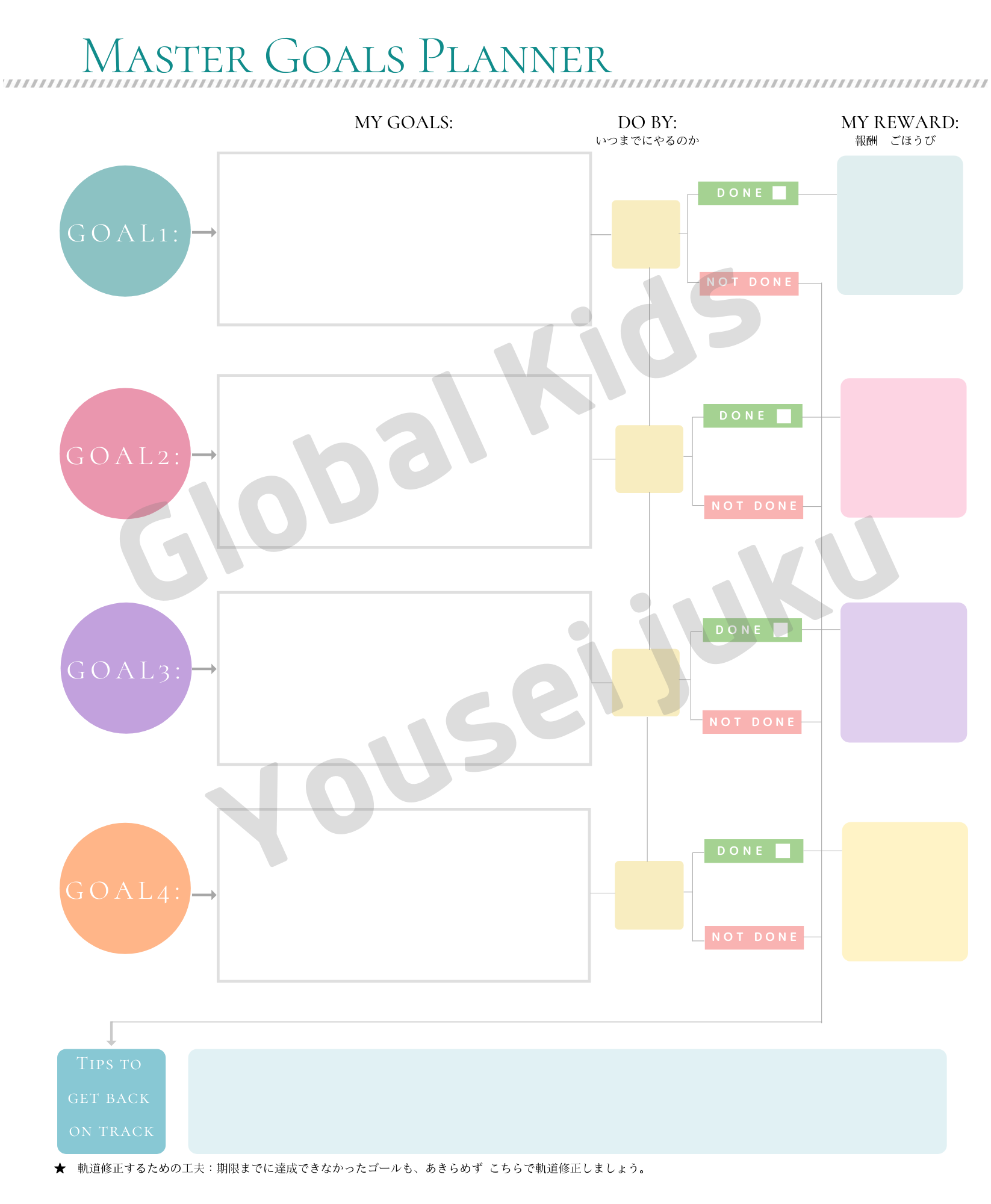 教材や印刷素材のダウンロード、プリントアウト、その他の⽅法による複製は、個⼈的⼜は家庭内での限られた範囲における私的使⽤に限らせていただきます。この教材サイト、グローバルキッズ養成塾ウェブサイト内の情報及びコンテンツを、他のホームページや印刷物に転⽤(コピー、アップロード、掲載、引⽤などすることはお控え下さい。その他、著作権法で認められている範囲を超えて、 この教材内に掲載されているコンテンツを無断で使⽤することはお控え下さい。