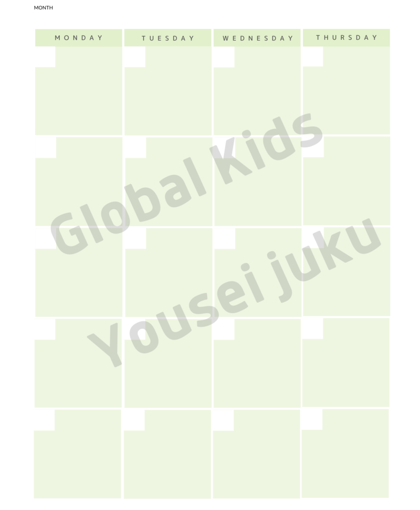 教材や印刷素材のダウンロード、プリントアウト、その他の⽅法による複製は、個⼈的⼜は家庭内での限られた範囲における私的使⽤に限らせていただきます。この教材サイト、グローバルキッズ養成塾ウェブサイト内の情報及びコンテンツを、他のホームページや印刷物に転⽤(コピー、アップロード、掲載、引⽤などすることはお控え下さい。その他、著作権法で認められている範囲を超えて、 この教材内に掲載されているコンテンツを無断で使⽤することはお控え下さい。