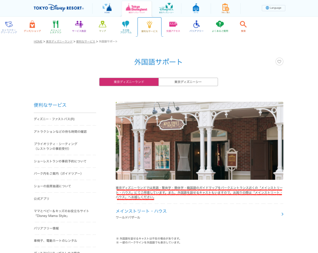また、外国語を話せるキャストもいますので、お困りの際は「メインストリート・ハウス」へお越しください。」とあり、外国語のガイドブックももらえます。