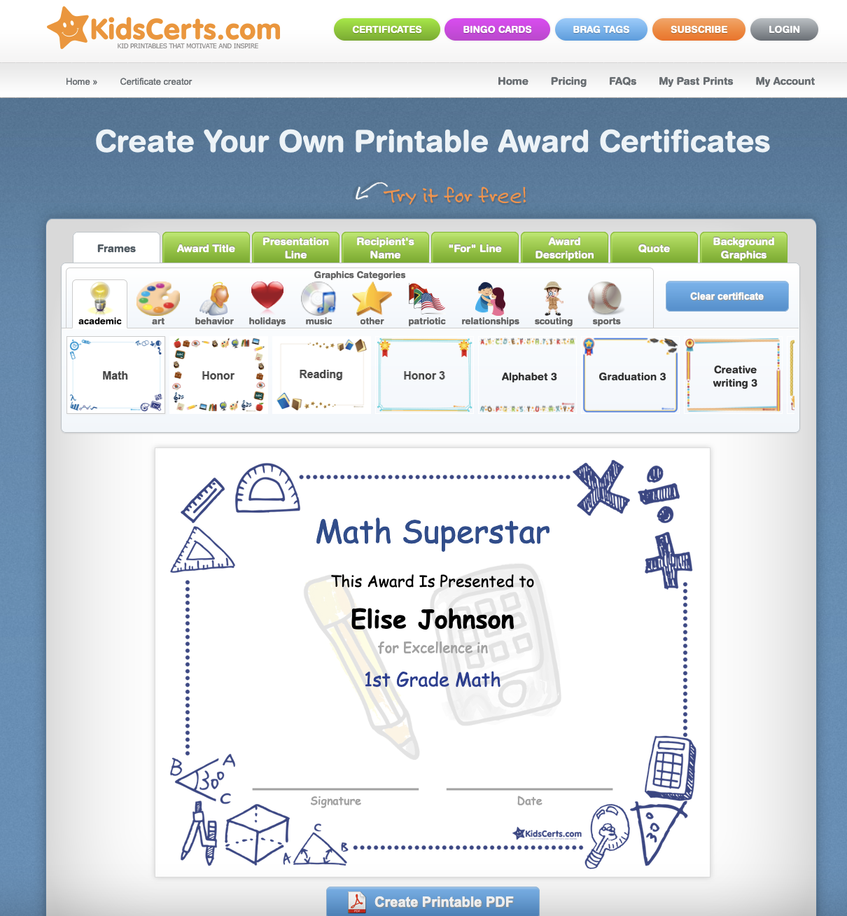 “free certificate for kids ” などのキーワードで探して見ましょう。
