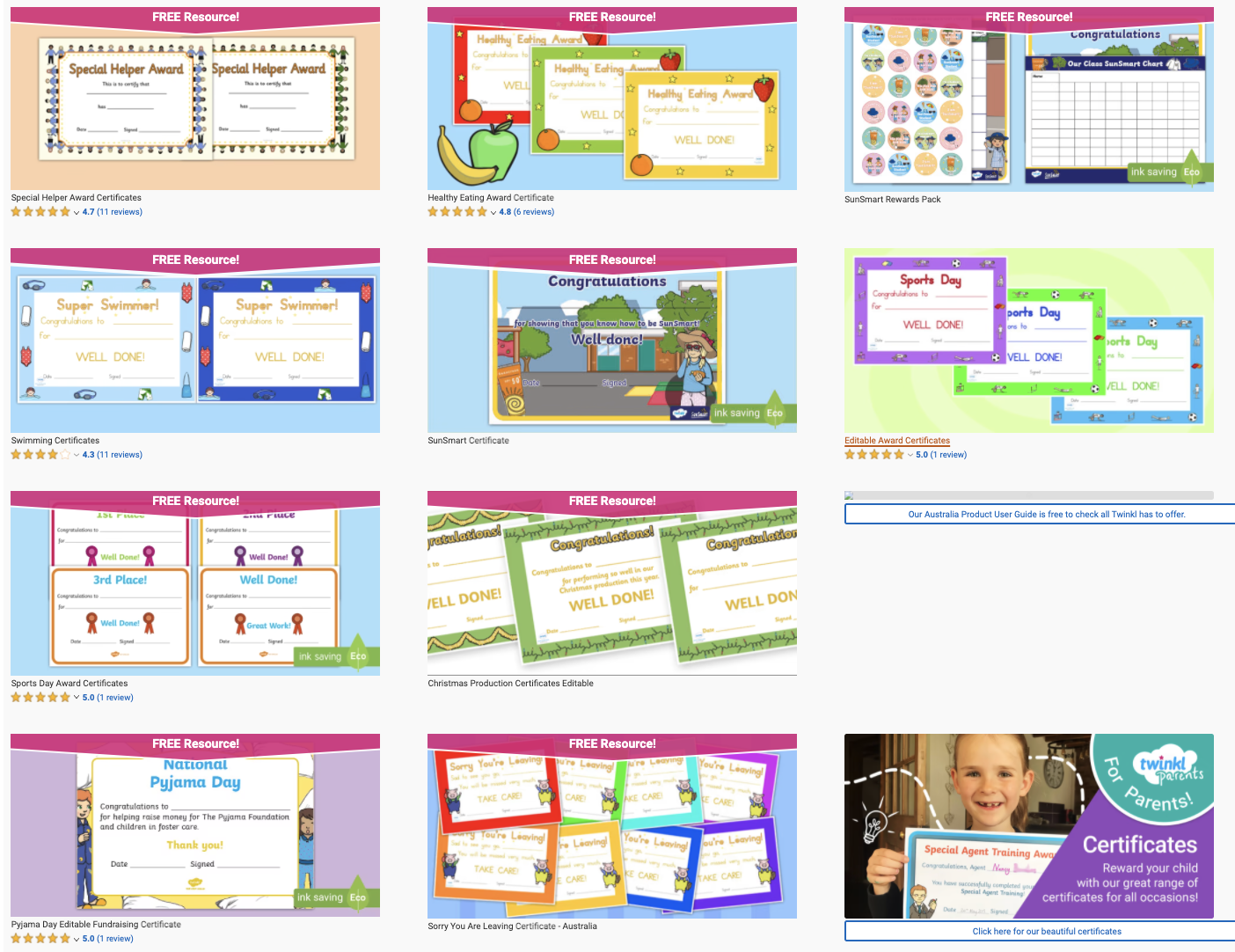 数千もの無料教材が手に入るtwinkl。こちらでも無料の表彰状がゲットできます。